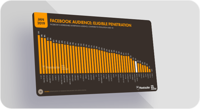 JAN FACEBOOK AUDIENCE: ELIGIBLE PENETRATION 2019 FACEBOOKâS ADDRESSABLE ADVERTISING AUDIENCE, COMPARED TO POPULATION AGED 13+ 105% 98%98% 90%90% 85%84%83%83%81% 81%79%79% 77%76%76%75%74% 72%71%71% 70% 67%66%64% 61%60%60%59% 57%56% 53%51%51%51% 44% 37% 35% 29%28% 23%22% 18% 11% 0.2% . S A A E A K . A L A . L S Y E A Y A T A A Y A E A A A A A A E I N O D G R I D M N A I I D M K I O N L I P D D I I N I I . E S N N R E . L Z D . A D E C S I Y C N N E D Y R A I A C N N B A S N U U K C A A B I N R R I D N A S N . N Y I O A D . A A I A G N N E T T A N P E S I I T X A O P M A N R R A R C P I A G R A A S W N A H U A W L L M E U L G U A R F L L O I E A U N I E I A T T B L N T A U N S E M H J G PP L K O A E L R O A R U K D K I R C I E A A N E W S R E A R T A O E R L L A M G L E I R F O R G I G T H G Z E V S U I B C O E D O I H P Z A E H R N H M R T N O D A P D T T G T O P N I C H N U I A O S W T I M U U E E A O W O W H N N S S S S SOURCE: EXTRAPOLATION OF FACEBOOK DATA (JANUARY 2019); KEPIOS ANALYSIS. 89