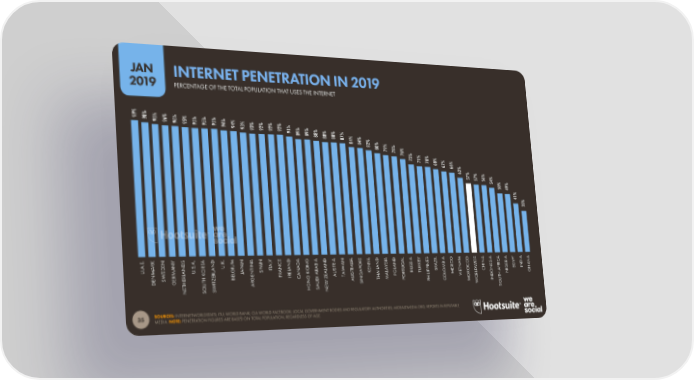 JAN INTERNET PENETRATION IN 2019 2019 PERCENTAGE OF THE TOTAL POPULATION THAT USES THE INTERNET 99%98%96%96%96% 95%95%95%95%94%94%93%93%92%92%92% 91%89%89%88%88%88% 87%84%84% 82%80%79% 78%76% 72%71%70%68% 67%66% 62% 57%57%56%54% 50%49% 41% 35% . K Y S . A . A Y E A A A A E A A L A Y S L A E A A A A T A A E N A D K M N N L D G I D I N I R D I D I I I O M O I I P I . R E N D . E . N I C D N L Y S N A E E Z D S C R Y A S R N U U A I A A N N B R A N S K B C A C I N I D N . A D A N . I P T N A T A O N Y G S N A I I E E A T P I A O A A S R P A A R I R M X N C W H R G N A U M E U O L G A A L R L W E L A L U U F I M A L J N S N I T A I T U B E T N G E H L K R R E K A U K L R PP O O D C A I N W R E E E R A A A S A O R T I E L R F E G A L L M I R O G E S E E H Z B G I C G I Z A T U H P O I V O R D H N D G T T R D A N T M P H O O T H I N U I P C N T U A O W S M I U E O W A E W O N S S H S N S SOURCES: INTERNETWORLDSTATS; ITU; WORLD BANK; CIA WORLD FACTBOOK; LOCAL GOVERNMENT BODIES AND REGULATORY AUTHORITIES; MIDEASTMEDIA.ORG; REPORTS IN REPUTABLE 35 MEDIA. NOTE: PENETRATION FIGURES ARE BASED ON TOTAL POPULATION, REGARDLESS OF AGE.