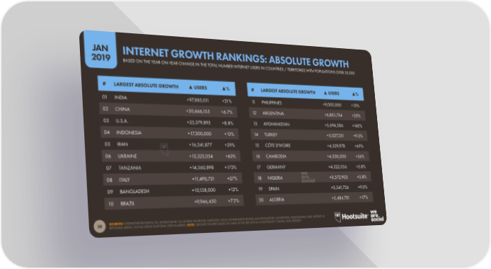 JAN INTERNET GROWTH RANKINGS: ABSOLUTE GROWTH 2019 BASED ON THE YEAR-ON-YEAR CHANGE IN THE TOTAL NUMBER INTERNET USERS IN COUNTRIES / TERRITORIES WITH POPULATIONS OVER 50,000 # LARGEST ABSOLUTE GROWTH ▲ USERS ▲% # LARGEST ABSOLUTE GROWTH ▲ USERS ▲% 01 INDIA +97,885,011 +21% 11 PHILIPPINES +9,000,000 +13% 02 CHINA +50,666,155 +6.7% 12 ARGENTINA +6,801,754 +20% 03 U.S.A. +25,379,895 +8.8% 13 AFGHANISTAN +5,694,586 +142% 04 INDONESIA +17,300,000 +13% 14 TURKEY +5,027,251 +9.3% 05 IRAN +16,241,877 +29% 15 CÔTE D'IVOIRE +4,529,978 +69% 06 UKRAINE +15,325,054 +60% 16 CAMBODIA +4,500,000 +56% 07 TANZANIA +14,560,898 +173% 17 GERMANY +4,322,056 +5.8% 08 ITALY +11,490,731 +27% 18 NIGERIA +3,572,903 +3.8% 09 BANGLADESH +10,158,000 +12% 19 SPAIN +3,541,726 +9.0% 10 BRAZIL +9,946,450 +7.2% 20 ALGERIA +3,484,731 +17% SOURCES: INTERNETWORLDSTATS; ITU; WORLD BANK; CIA WORLD FACTBOOK; EUROSTAT; LOCAL GOVERNMENT BODIES AND REGULATORY AUTHORITIES; MIDEASTMEDIA.ORG; REPORTS IN 38 REPUTABLE MEDIA; SOCIAL MEDIA PLATFORM USER NUMBERS. NOTE: GROWTH FIGURES BASED ON DATA IN WE ARE SOCIAL & HOOTSUITE’S ‘DIGITAL 2018’ REPORTS.