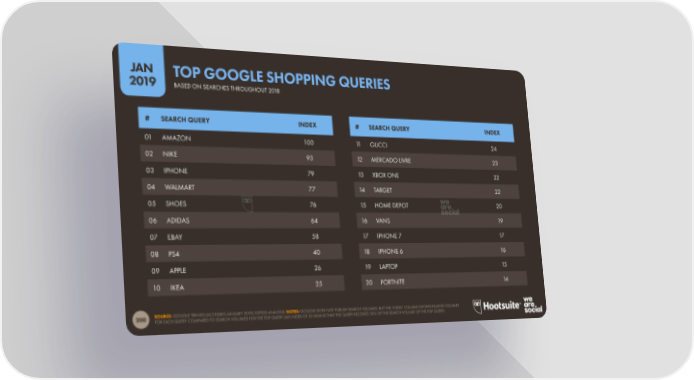 JAN TOP GOOGLE SHOPPING QUERIES 2019 BASED ON SEARCHES THROUGHOUT 2018 # SEARCH QUERY INDEX # SEARCH QUERY INDEX 01 AMAZON 100 11 GUCCI 24 02 NIKE 93 12 MERCADO LIVRE 23 03 IPHONE 79 13 XBOX ONE 22 04 WALMART 77 14 TARGET 22 05 SHOES 76 15 HOME DEPOT 20 06 ADIDAS 64 16 VANS 19 07 EBAY 58 17 IPHONE 7 17 08 PS4 40 18 IPHONE 6 16 09 APPLE 26 19 LAPTOP 15 10 IKEA 25 20 FORTNITE 14 SOURCE: GOOGLE TRENDS (ACCESSED JANUARY 2019); KEPIOS ANALYSIS. NOTES: GOOGLE DOES NOT PUBLISH SEARCH VOLUMES, BUT THE ‘INDEX’ COLUMN SHOWS RELATIVE VOLUMES 200 FOR EACH QUERY COMPARED TO SEARCH VOLUMES FOR THE TOP QUERY (AN INDEX OF 50 MEANS THAT THE QUERY RECEIVED 50% OF THE SEARCH VOLUME OF THE TOP QUERY).