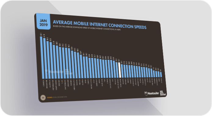 JAN AVERAGE MOBILE INTERNET CONNECTION SPEEDS 2019 BASED ON THE AVERAGE DOWNLOAD SPEED OF MOBILE INTERNET CONNECTIONS, IN MBPS 63.161.0 56.555.1 51.050.2 48.147.547.346.5 42.841.3 40.3 36.9 34.134.132.032.0 31.730.930.229.729.429.3 29.227.9 25.525.1 22.121.621.220.820.819.9 19.419.017.617.5 17.015.515.1 11.710.510.1 8.8 A E A S A . K E A Y . Y L Y A A . A E L A A A A T A S A A A A R I M E D N D N I N G A N L I K D D M I O O I I D I P I I I D L D E . R E N C I E . N A . N C D Z S N Y Y E R S R U A N A R A K N S A A N B U I I N A C C I S N B D N A O A N I . A D N T . A P G T I A I Y S N N E E P R A A S P R O I H A A R W A N R X C T A M G I N A O G U L M E L W A U A U R L F L A U L E I N A T A L I S U M J T T B E N I E G N H L K R A R U K C A D E O L R O K PP I A S E E N W A T R R A O L R E E A I G R E F I M R A L L O G C U E H B Z E S Z T A G E O I P H R I V O G H I N D N A T T D G P D T O M R T O H I H I N U C P N S T U W O U M A I E O W E A O W N S S N H S S SOURCE: OOKLA (DECEMBER 2018). 50
