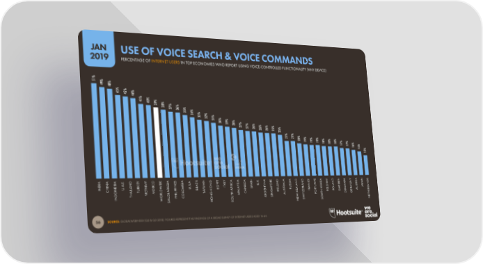 JAN USE OF VOICE SEARCH & VOICE COMMANDS 2019 PERCENTAGE OF INTERNET USERS IN TOP ECONOMIES WHO REPORT USING VOICE-CONTROLLED FUNCTIONALITY (ANY DEVICE) 51% 49% 48% 45% 45%44% 41%40% 39% 38% 37%36% 35%34% 33% 32%31% 30%29% 28% 27% 27%26% 26%26%25% 25% 21% 21%20% 19%19% 19%18% 18%18% 17% 17%16% 15% 13% global web index A A A . Y E A S A . L T Y A A A . A E A A E L A K Y A S I I E D M O I I A I N G P L I N K R D I I D D M D N I N S . E D E . Z Y C S D I . N L N C A E N E R N D D N A N K A C I B B S A N A I A U I N S N R U R A I E . I N . A T Y A O A S N G I D A A T P N N H A R N X W A I M R O G I R P T P A R A A A S I U L R U W F A L U L L A U O G L E M A N I U T E B I E N S N A T T L M J A C D PP O K A L E R A R R K U L A T E L A I A A E R S E R E O W N R O I M L L A G E F R D H V R I I T G H C G I U Z Z O H B P S E E A E T O D H O T M R N A T P T D G N U P C N I I H I O U A S W U T W A O E W O E S H S N S S N SOURCE: GLOBALWEBINDEX (Q2 & Q3 2018). FIGURES REPRESENT THE FINDINGS OF A BROAD SURVEY OF INTERNET USERS AGED 16-64. 56