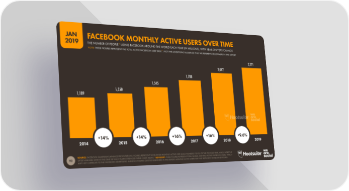 JAN FACEBOOK MONTHLY ACTIVE USERS OVER TIME 2019 THE NUMBER OF PEOPLE* USING FACEBOOK AROUND THE WORLD EACH YEAR (IN MILLIONS), WITH YEAR-ON-YEAR CHANGE NOTE: THESE FIGURES REPRESENT THE TOTAL ACTIVE FACEBOOK USER BASE*, NOT THE ADVERTISING AUDIENCE THAT WE REFERENCE ELSEWHERE IN THIS REPORT 2,271 2,072 1,788 1,545 1,350 1,189 +14% +14% +16% +16% +9.6% 2014 2015 2016 2017 2018 2019 SOURCE: FACEBOOK QUARTERLY EARNINGS PRESENTATIONS. FIGURES REPRESENT WORLDWIDE MONTHLY ACTIVE USER (MAU) NUMBERS FOR Q3 OF THE PREVIOUS YEAR, WHICH WERE THE LATEST AVAILABLE DATA AT THE START OF EACH YEAR REFERENCED IN THE CHART ABOVE. *ADVISORY: THESE FIGURES REPRESENT TOTAL GLOBAL MONTHLY ACTIVE FACEBOOK USERS, WHICH 92 MAY NOT CORRELATE TO THE FACEBOOK ADVERTISING AUDIENCE FIGURES QUOTED ELSEWHERE IN THIS REPORT. MONTHLY ACTIVE USERS MAY NOT REPRESENT UNIQUE INDIVIDUALS.