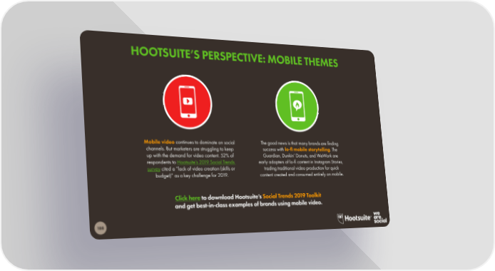 HOOTSUITE’S PERSPECTIVE: MOBILE THEMES Mobile video continues to dominate on social The good news is that many brands are finding channels. But marketers are struggling to keep success with lo-fi mobile storytelling. The up with the demand for video content. 52% of Guardian, Dunkin’ Donuts, and WeWork are respondents to Hootsuite’s 2019 Social Trends early adopters of lo-fi content in Instagram Stories, survey cited a “lack of video creation (skills or trading traditional video production for quick budget)” as a key challenge for 2019. content created and consumed entirely on mobile. Click here to download Hootsuite’s Social Trends 2019 Toolkit and get best-in-class examples of brands using mobile video. 188