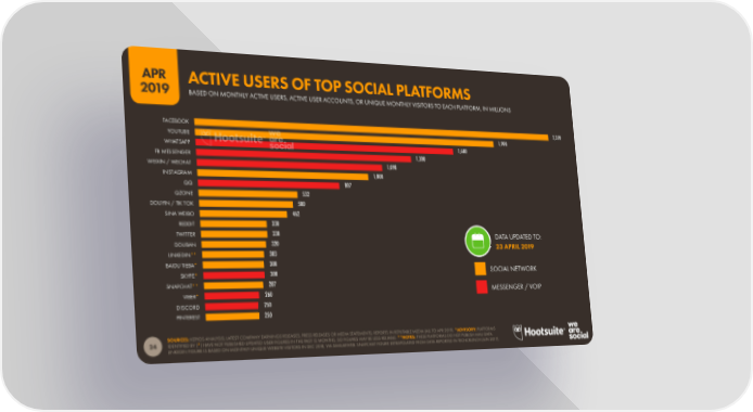 APR ACTIVE USERS OF TOP SOCIAL PLATFORMS 2019 BASED ON MONTHLY ACTIVE USERS, ACTIVE USER ACCOUNTS, OR UNIQUE MONTHLY VISITORS TO EACH PLATFORM, IN MILLIONS FACEBOOK 2,320 YOUTUBE 1,900 WHATSAPP 1,600 FB MESSENGER 1,300 WEIXIN / WECHAT 1,098 INSTAGRAM 1,000 QQ 807 QZONE 532 DOUYIN / TIK TOK 500 SINA WEIBO 462 REDDIT 330 TWITTER 330 DATA UPDATED TO: DOUBAN 320 23 APRIL 2019 LINKEDIN** 303 BAIDU TIEBA* 300 SKYPE* 300 SOCIAL NETWORK SNAPCHAT** 287 VIBER* 260 MESSENGER / VOIP DISCORD 250 PINTEREST 250 SOURCES: KEPIOS ANALYSIS; LATEST COMPANY EARNINGS RELEASES, PRESS RELEASES OR MEDIA STATEMENTS; REPORTS IN REPUTABLE MEDIA (ALL TO APR 2019). *ADVISORY: PLATFORMS IDENTIFIED BY (*) HAVE NOT PUBLISHED UPDATED USER FIGURES IN THE PAST 12 MONTHS, SO FIGURES MAY BE LESS RELIABLE. **NOTES: THESE PLATFORMS DO NOT PUBLISH MAU DATA. 24 LINKEDIN FIGURE IS BASED ON MONTHLY UNIQUE WEBSITE VISITORS IN DEC 2018, VIA SIMILARWEB. SNAPCHAT FIGURE EXTRAPOLATED FROM DATA REPORTED IN TECHCRUNCH (JUN 2017).