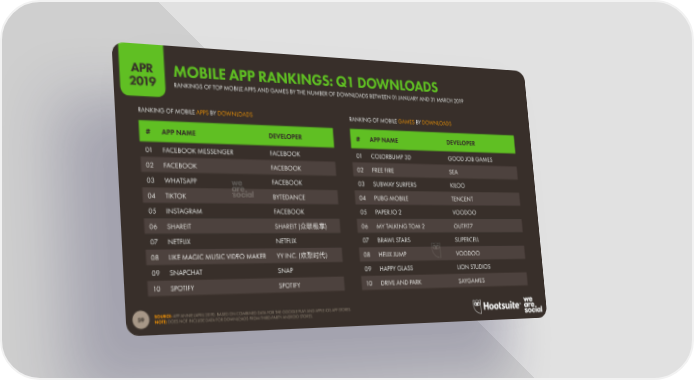APR MOBILE APP RANKINGS: Q1 DOWNLOADS 2019 RANKINGS OF TOP MOBILE APPS AND GAMES BY THE NUMBER OF DOWNLOADS BETWEEN 01 JANUARY AND 31 MARCH 2019 RANKING OF MOBILE APPS BY DOWNLOADS RANKING OF MOBILE GAMES BY DOWNLOADS # APP NAME DEVELOPER # APP NAME DEVELOPER 01 FACEBOOK MESSENGER FACEBOOK 01 COLORBUMP 3D GOOD JOB GAMES 02 FACEBOOK FACEBOOK 02 FREE FIRE SEA 03 WHATSAPP FACEBOOK 03 SUBWAY SURFERS KILOO 04 TIKTOK BYTEDANCE 04 PUBG MOBILE TENCENT 05 INSTAGRAM FACEBOOK 05 PAPER.IO 2 VOODOO 06 SHAREIT SHAREIT (众联极享) 06 MY TALKING TOM 2 OUTFIT7 07 NETFLIX NETFLIX 07 BRAWL STARS SUPERCELL 08 LIKE MAGIC MUSIC VIDEO MAKER YY INC. (欢聚时代) 08 HELIX JUMP VOODOO 09 SNAPCHAT SNAP 09 HAPPY GLASS LION STUDIOS 10 SPOTIFY SPOTIFY 10 DRIVE AND PARK SAYGAMES SOURCE: APP ANNIE (APRIL 2019). BASED ON COMBINED DATA FOR THE GOOGLE PLAY AND APPLE iOS APP STORES. 59 NOTE: DOES NOT INCLUDE DATA FOR DOWNLOADS FROM THIRD-PARTY ANDROID STORES.