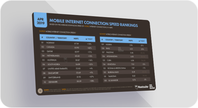 APR MOBILE INTERNET CONNECTION SPEED RANKINGS 2019 BASED ON THE AVERAGE DOWNLOAD SPEED OF MOBILE INTERNET CONNECTIONS, IN MBPS FASTEST MOBILE INTERNET CONNECTION SPEEDS* SLOWEST MOBILE INTERNET CONNECTION SPEEDS* # COUNTRY / TERRITORY MBPS ▲ Y-O-Y # COUNTRY / TERRITORY MBPS ▲ Y-O-Y 01 NORWAY 67.54 +10% 139 ALGERIA 5.96 -21% 02 CANADA 65.90 +42% 138 IRAQ 6.01 -23% 03 QATAR 60.97 +11% 137 PALESTINE 6.46 [N/A] 04 NETHERLANDS 60.60 +10% 136 AFGHANISTAN 6.83 [N/A] 05 AUSTRALIA 58.87 +16% 135 CUBA 6.84 [N/A] 06 SOUTH KOREA 54.89 +32% 134 VENEZUELA 7.05 -15% 07 UNITED ARAB EMIRATES 53.83 +4% 133 BOSNIA & HERZEGOVINA 7.87 +1% 08 SINGAPORE 53.69 +2% 132 BURKINA FASO 8.49 [N/A] 09 SWITZERLAND 51.93 +27% 131 TAJIKISTAN 8.62 [N/A] 10 DENMARK 50.59 +18% 130 EL SALVADOR 8.76 -3% SOURCE: OOKLA (MARCH 2019). *NOTES: DATA ARE NOT AVAILABLE FOR ALL COUNTRIES AND TERRITORIES, SO THESE RANKINGS ARE BASED SOLELY ON THOSE COUNTRIES AND TERRITORIES 13 FOR WHICH DATA ARE AVAILABLE. FIGURES REPRESENT AVERAGE DOWNLOAD SPEEDS. YEAR-ON-YEAR CHANGE DATA VERSUS MARCH 2018.