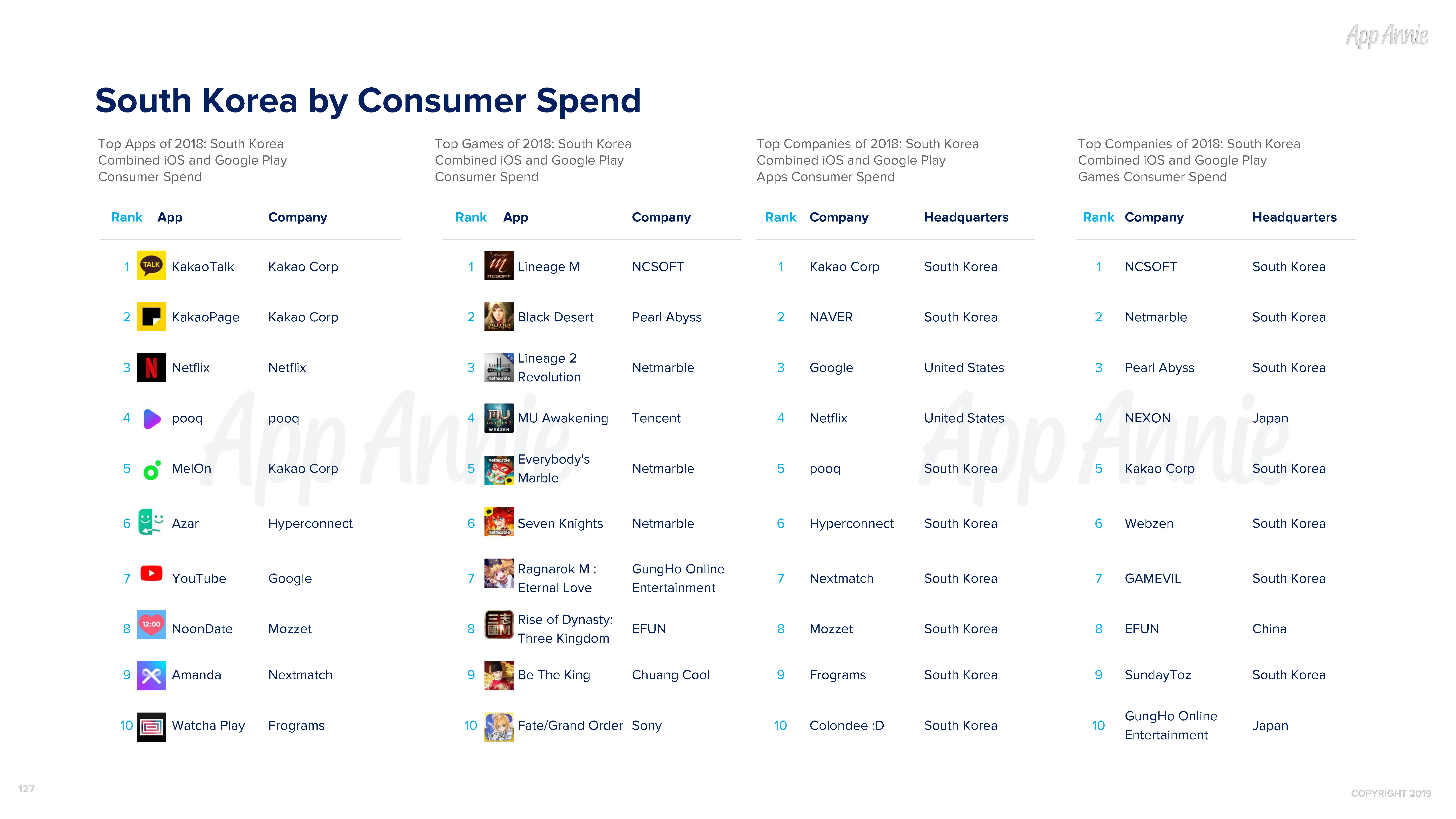 South Korea by Consumer Spend Top Apps of 2018: South Korea Top Games of 2018: South Korea Top Companies of 2018: South Korea Top Companies of 2018: South Korea Combined iOS and Google Play Combined iOS and Google Play Combined iOS and Google Play Combined iOS and Google Play Consumer Spend Consumer Spend Apps Consumer Spend Games Consumer Spend Rank App Company Rank App Company Rank Company Headquarters Rank Company Headquarters 1 KakaoTalk Kakao Corp 1 Lineage M NCSOFT 1 Kakao Corp South Korea 1 NCSOFT South Korea 2 KakaoPage Kakao Corp 2 Black Desert Pearl Abyss 2 NAVER South Korea 2 Netmarble South Korea Lineage 2 3 Netflix Netflix 3 Netmarble 3 Google United States 3 Pearl Abyss South Korea Revolution 4 pooq pooq 4 MU Awakening Tencent 4 Netflix United States 4 NEXON Japan Everybody's 5 MelOn Kakao Corp 5 Netmarble 5 pooq South Korea 5 Kakao Corp South Korea Marble 6 Azar Hyperconnect 6 Seven Knights Netmarble 6 Hyperconnect South Korea 6 Webzen South Korea Ragnarok M : GungHo Online 7 YouTube Google 7 7 Nextmatch South Korea 7 GAMEVIL South Korea Eternal Love Entertainment Rise of Dynasty: 8 NoonDate Mozzet 8 EFUN 8 Mozzet South Korea 8 EFUN China Three Kingdom 9 Amanda Nextmatch 9 Be The King Chuang Cool 9 Frograms South Korea 9 SundayToz South Korea GungHo Online 10 Watcha Play Frograms 10 Fate/Grand Order Sony 10 Colondee :D South Korea 10 Japan Entertainment 127 COPYRIGHT 2019