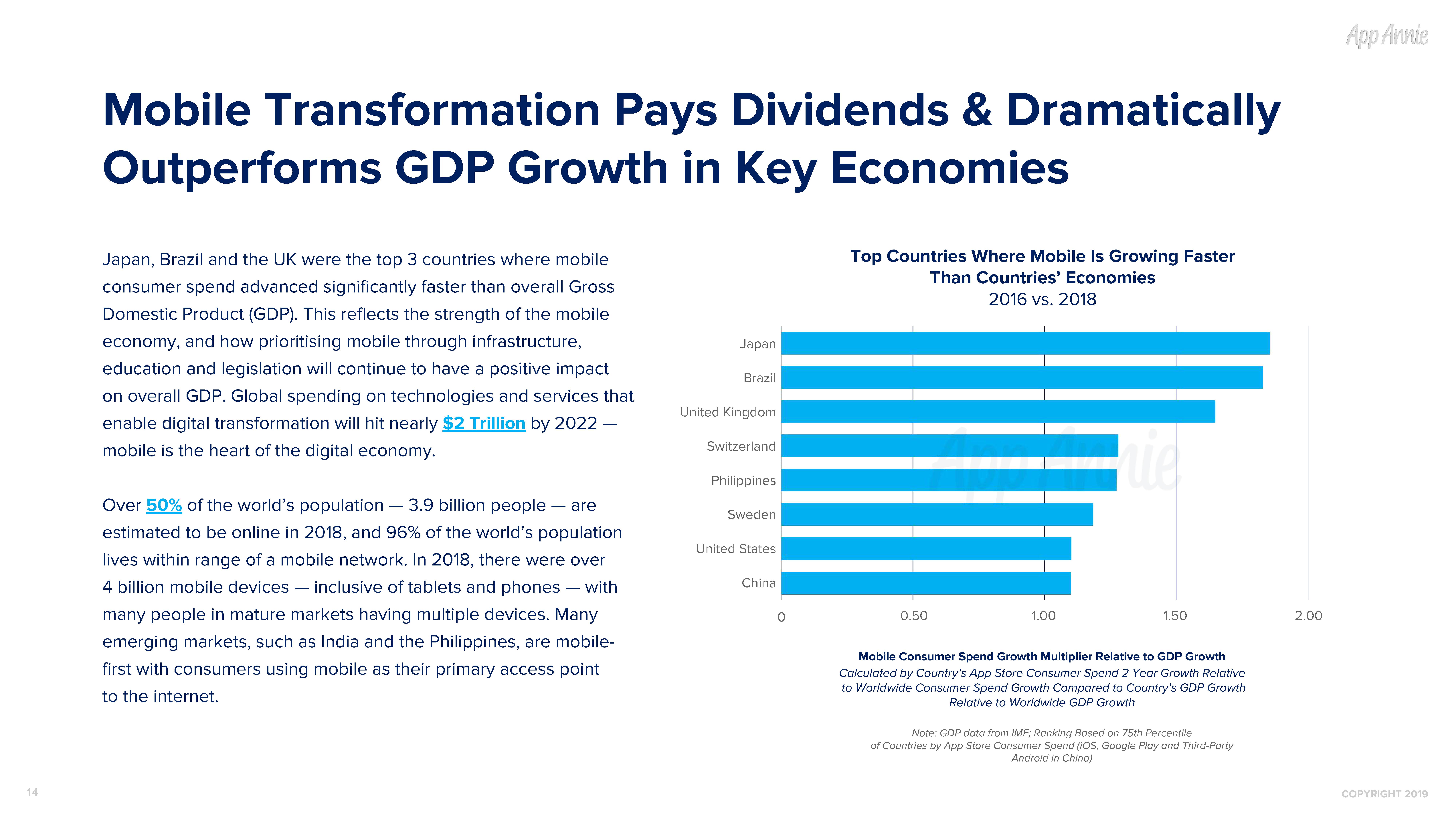 Mobile Transformation Pays Dividends & Dramatically Outperforms GDP Growth in Key Economies Top Countries Where Mobile Is Growing Faster Japan, Brazil and the UK were the top 3 countries where mobile Than Countries’ Economies consumer spend advanced significantly faster than overall Gross 2016 vs. 2018 Domestic Product (GDP). This reflects the strength of the mobile economy, and how prioritising mobile through infrastructure, Japan education and legislation will continue to have a positive impact Brazil on overall GDP. Global spending on technologies and services that United Kingdom enable digital transformation will hit nearly $2 Trillion by 2022 — Switzerland mobile is the heart of the digital economy. Philippines Over 50% of the world’s population — 3.9 billion people — are Sweden estimated to be online in 2018, and 96% of the world’s population United States lives within range of a mobile network. In 2018, there were over China 4 billion mobile devices — inclusive of tablets and phones — with many people in mature markets having multiple devices. Many 0.50 1.00 1.50 2.00 0 emerging markets, such as India and the Philippines, are mobile- Mobile Consumer Spend Growth Multiplier Relative to GDP Growth first with consumers using mobile as their primary access point Calculated by Country’s App Store Consumer Spend 2 Year Growth Relative to Worldwide Consumer Spend Growth Compared to Country’s GDP Growth to the internet. Relative to Worldwide GDP Growth Note: GDP data from IMF; Ranking Based on 75th Percentile of Countries by App Store Consumer Spend (iOS, Google Play and Third-Party Android in China) 14 COPYRIGHT 2019
