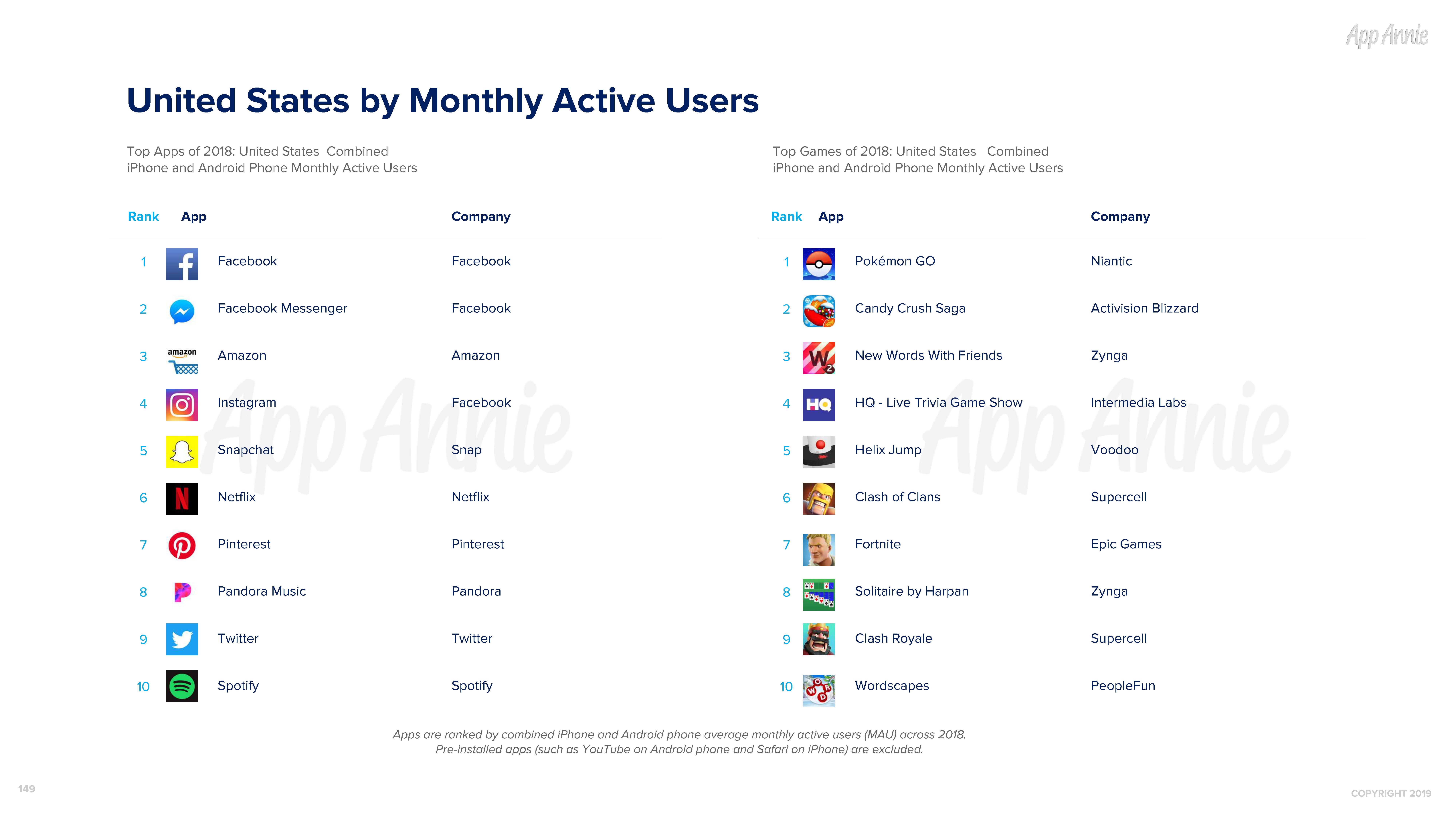 United States by Monthly Active Users Top Apps of 2018: United States Combined Top Games of 2018: United States Combined iPhone and Android Phone Monthly Active Users iPhone and Android Phone Monthly Active Users Rank App Company Rank App Company Facebook Facebook Pokémon GO Niantic 1 1 Facebook Messenger Facebook Candy Crush Saga Activision Blizzard 2 2 Amazon Amazon New Words With Friends Zynga 3 3 Instagram Facebook HQ - Live Trivia Game Show Intermedia Labs 4 4 Snapchat Snap Helix Jump Voodoo 5 5 Netflix Netflix Clash of Clans Supercell 6 6 Pinterest Pinterest Fortnite Epic Games 7 7 Pandora Music Pandora Solitaire by Harpan Zynga 8 8 Twitter Twitter Clash Royale Supercell 9 9 Spotify Spotify Wordscapes PeopleFun 10 10 Apps are ranked by combined iPhone and Android phone average monthly active users (MAU) across 2018. Pre-installed apps (such as YouTube on Android phone and Safari on iPhone) are excluded. 149 COPYRIGHT 2019