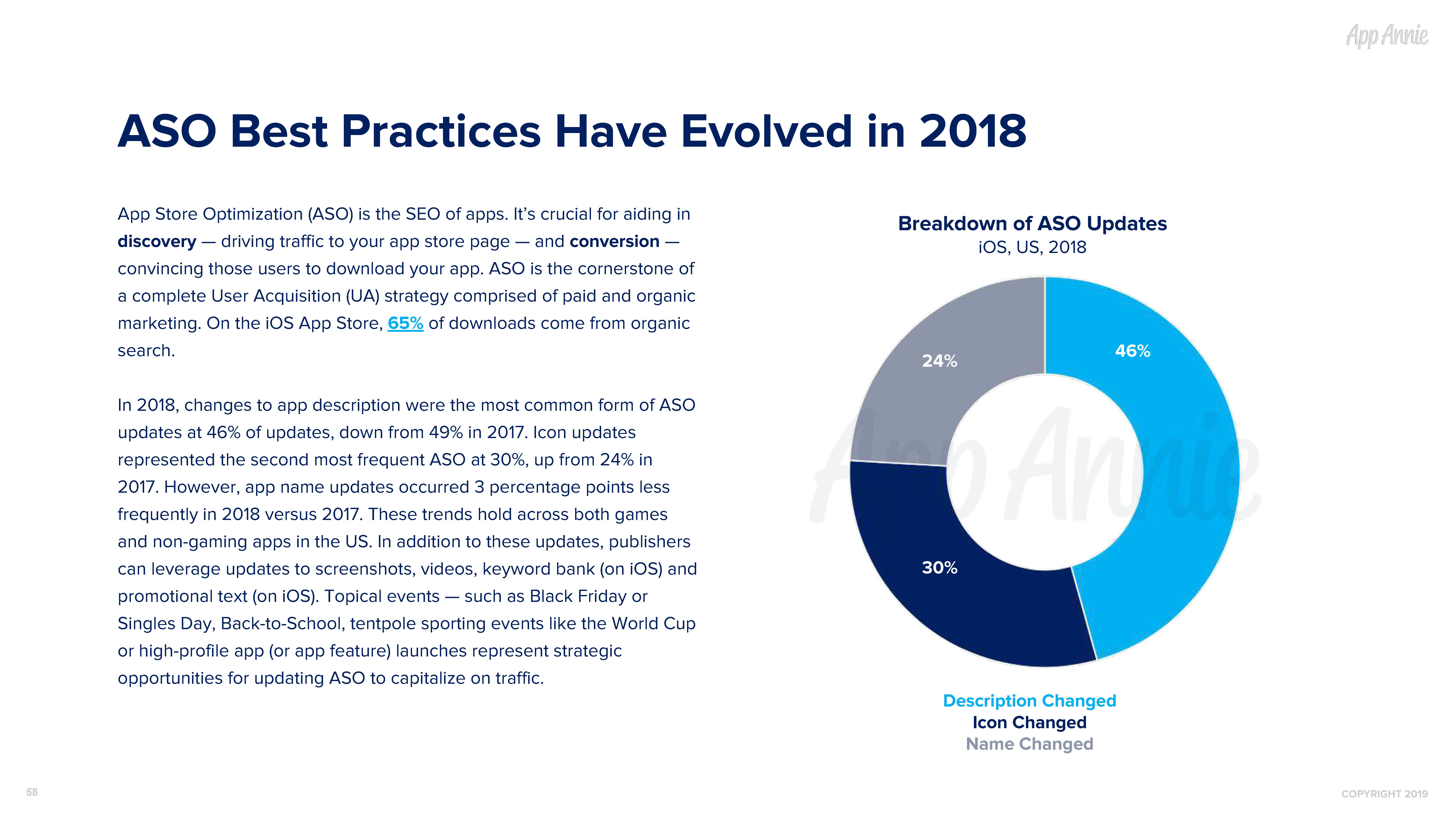 ASO Best Practices Have Evolved in 2018 App Store Optimization (ASO) is the SEO of apps. It’s crucial for aiding in Breakdown of ASO Updates discovery — driving traffic to your app store page — and conversion — iOS, US, 2018 convincing those users to download your app. ASO is the cornerstone of a complete User Acquisition (UA) strategy comprised of paid and organic marketing. On the iOS App Store, 65% of downloads come from organic search. 46% 24% In 2018, changes to app description were the most common form of ASO updates at 46% of updates, down from 49% in 2017. Icon updates represented the second most frequent ASO at 30%, up from 24% in 2017. However, app name updates occurred 3 percentage points less frequently in 2018 versus 2017. These trends hold across both games and non-gaming apps in the US. In addition to these updates, publishers 30% can leverage updates to screenshots, videos, keyword bank (on iOS) and promotional text (on iOS). Topical events — such as Black Friday or Singles Day, Back-to-School, tentpole sporting events like the World Cup or high-profile app (or app feature) launches represent strategic opportunities for updating ASO to capitalize on traffic. Description Changed Icon Changed Name Changed 58 COPYRIGHT 2019