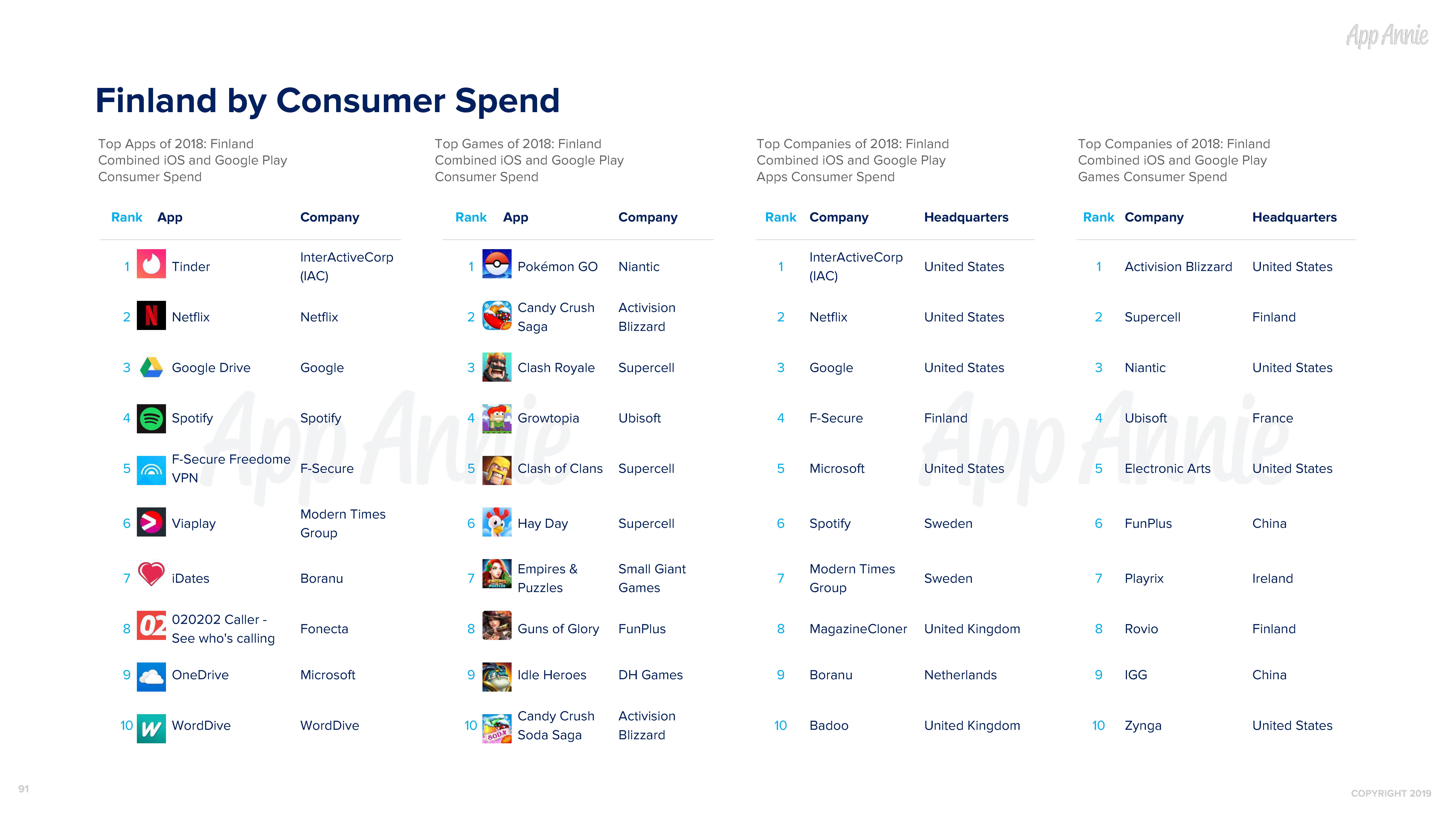 Finland by Consumer Spend Top Apps of 2018: Finland Top Games of 2018: Finland Top Companies of 2018: Finland Top Companies of 2018: Finland Combined iOS and Google Play Combined iOS and Google Play Combined iOS and Google Play Combined iOS and Google Play Consumer Spend Consumer Spend Apps Consumer Spend Games Consumer Spend Rank App Company Rank App Company Rank Company Headquarters Rank Company Headquarters InterActiveCorp InterActiveCorp 1 Tinder 1 Pokémon GO Niantic 1 United States 1 Activision Blizzard United States (IAC) (IAC) Candy Crush Activision 2 Netflix Netflix 2 2 Netflix United States 2 Supercell Finland Saga Blizzard 3 Google Drive Google 3 Clash Royale Supercell 3 Google United States 3 Niantic United States 4 Spotify Spotify 4 Growtopia Ubisoft 4 F-Secure Finland 4 Ubisoft France F-Secure Freedome 5 F-Secure 5 Clash of Clans Supercell 5 Microsoft United States 5 Electronic Arts United States VPN Modern Times 6 Viaplay 6 Hay Day Supercell 6 Spotify Sweden 6 FunPlus China Group Empires & Small Giant Modern Times 7 iDates Boranu 7 7 Sweden 7 Playrix Ireland Puzzles Games Group 020202 Caller - 8 Fonecta 8 Guns of Glory FunPlus 8 MagazineCloner United Kingdom 8 Rovio Finland See who's calling 9 OneDrive Microsoft 9 Idle Heroes DH Games 9 Boranu Netherlands 9 IGG China Candy Crush Activision 10 WordDive WordDive 10 10 Badoo United Kingdom 10 Zynga United States Soda Saga Blizzard 91 COPYRIGHT 2019